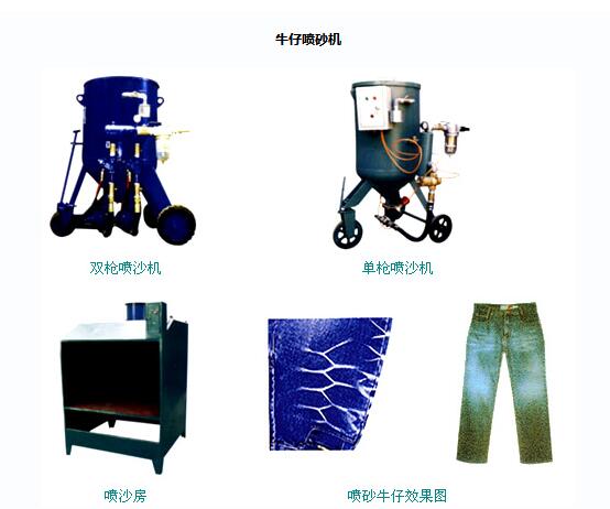 1.牛仔噴砂機是空壓機的壓縮空氣為動力,用噴槍將金剛砂直接噴射到牛仔褲上,使牛仔褲起到粗化、發(fā)白的效果。并可用模板制成顧 客需求的美麗圖案進行噴砂。完成一件牛仔褲僅需幾秒鐘時間。本機結構合理,操作方便,成本低、產(chǎn)量大。廣泛適用于國內(nèi)各中小型服裝廠使用。